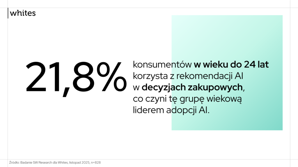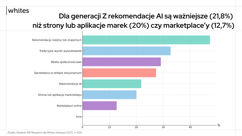W badaniu SW Research i Whites z listopada 2025 r. aż 21,8% osób w wieku do 24 lat wskazało AI jako źródło wpływu na decyzje zakupowe. Rekomendacje AI przebiły strony www i aplikacje marek czy marketplace’y. Widać więc, że przyszłość SEO to nie optymalizacja pod wyszukiwarkę, lecz pod odpowiedź AI.