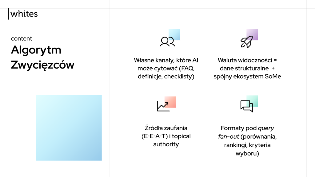 Dla marek i specjalistów SEO to oznacza konieczność przeprojektowania strategii – nie pozycjonowania „pod słowo kluczowe”, ale „pod odpowiedź”. Widoczność zależy od: