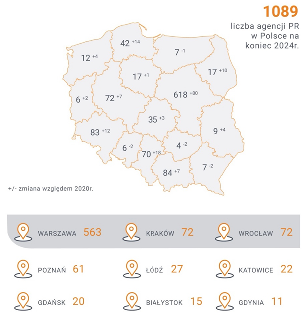 Nie dziwi fakt, że najwięcej agencji PR-owych w Polsce (około 60%) jest zarejestrowanych w województwie mazowieckim. Prym wiedzie w tym przypadku Warszawa z 563 tego typu podmiotami. Na drugim miejscu pod tym względem znajduje się województwo małpolskie (84 firmy, Kraków – 72), a podium zamyka Dolny Śląsk (83, Wrocław – 72).