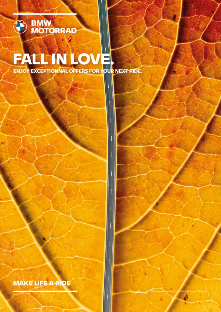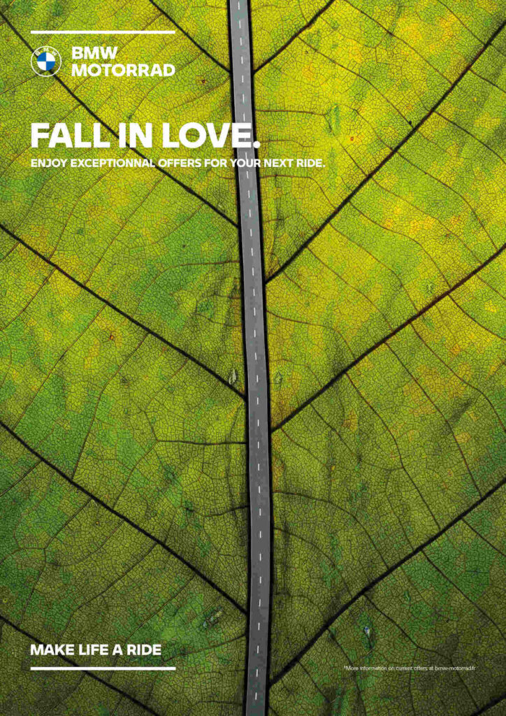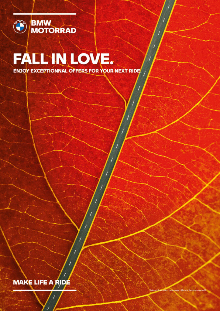 Jesień to nie jest ulubiona pora roku motocyklistów. Pogoda pogarsza się, coraz mniej jest słonecznych dni, które zostają zastąpione przez deszcz i wiatr. Koncern BMW Motorrad chce przekonać kierowców motocykli, że jesienią nie warto jednak rezygnować z przejażdżek, warto się za to zakochać w tej części roku. „Fall in Love” (pol. „Zakochaj się”) to kampania, której warstwa graficzna została zainspirowana naturą. W różnokolorowe liście – symbol jesieni – zostały wkomponowane ulice.