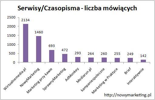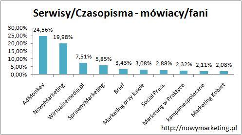 Wśród Serwisów/Czasopism największą liczbą fanów mogą pochwalić się Wirtualnemedia.pl z wynikiem 28 148, Mediarun.pl z 26 540 fanami oraz Marketing przy kawie, który ma 22 528 fanów. Pozostałe fan page’e z pierwszej dziesiątki mają nieco niższe statystyki. Na dalszych pozycjach znalazły się kampaniespoleczne, Marketing w Praktyce, Interaktywnie, SprawnyMarketing, Proto, NowyMarketing i zamykający dziesiątkę Brief posiadający 7 269 fanów.
