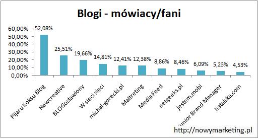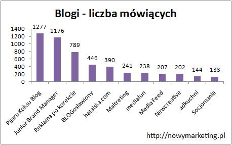 Gdy wzięliśmy pod uwagę jedynie liczbę mówiących pierwszą pozycję zajął Pijaru Koksu Blog z 1 277 mówiącymi. Na liście pojawiły się aż 4 blogi nie znajdujące się na liście top 10 pod względem liczby fanów, poza zwycięzcą są to: BLOGosławiony, Maltreting, Media feed i Newcreative. Drugie i trzecie miejsce należą do zwycięzców poprzedniej kategorii: Junior Brand Managera z wynikiem 1 176 i Reklamy po korekcie z 789 mówiącymi.