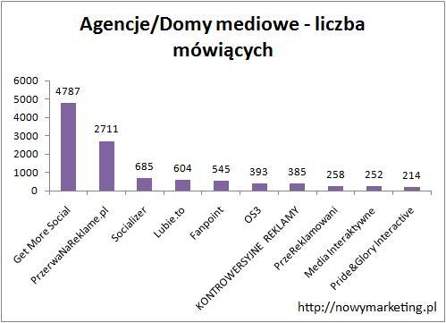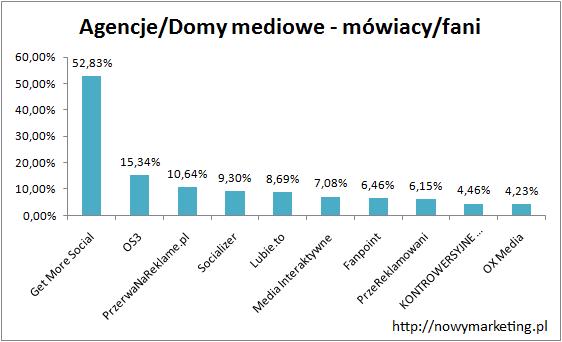 W przypadku relacji mówiących do fanów ranking znacznie zmienia swój wygląd. Pierwsze miejsce zajmuje AdMonkey z wynikiem 24,56%, która nie dostała się do pierwszej dziesiątki pod względem liczby fanów, a w rankingu mówiących była na piątym miejscu. Drugie miejsce i 19,98% należy do NowegoMarketingu. Trzecie miejsce należy do Wirtualnemedia.pl ze znacznie niższym wynikiem 7,51%. W tym rankingu pojawiają się fan page’e, które nie miałby szans na pojawienie się w zestawieniu według liczby fanów takie jak Marketing Kobiet czy Social Press.