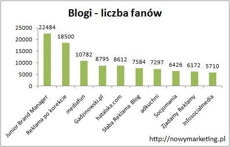 Z fan page’mi blogów postąpiliśmy analogicznie. Pierwszy ustaliliśmy ranking według liczby fanów. Pierwsze miejsce bezapelacyjnie zgarnął Junior Brand Manager posiadający 22 484 fanów. Drugie miejsce zajęła Reklama po korekcie z 18 500 fanami. Na trzeciej pozycji znalazł się Mediafun z 10 782 fanami. Dalsze pozycje zajmują: Gadzinowski.pl, hatalska.com, Słaba Reklama Blog, adkuchni, Socjomania, Zjadamy Reklamy i Infosocialmedia.