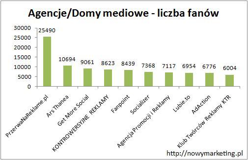 W ostatniej kategorii porównywaliśmy Agencje i Domy mediowe. Pod względem liczby fanów bezkonkurencyjny jest fan page PrzerwaNaReklame.pl (za którą stoi Agencja Marketingowa Płodni.com), który ma 25 490 fanów czyli ponad dwukrotnie więcej fanów niż Ars Thanea znajdująca się na drugim miejscu z wynikiem 10 694. Na trzecim miejscu znalazł się fan page Get More Social posiadający 9 061 fanów. Kolejne miejsca zajmują: KONTROWERSYJNE REKLAMY, Fanpoint, Socializer, Agencja Promocji i Reklamy, Lubie.to, AdAction i Klub Twórców Reklamy KTR.