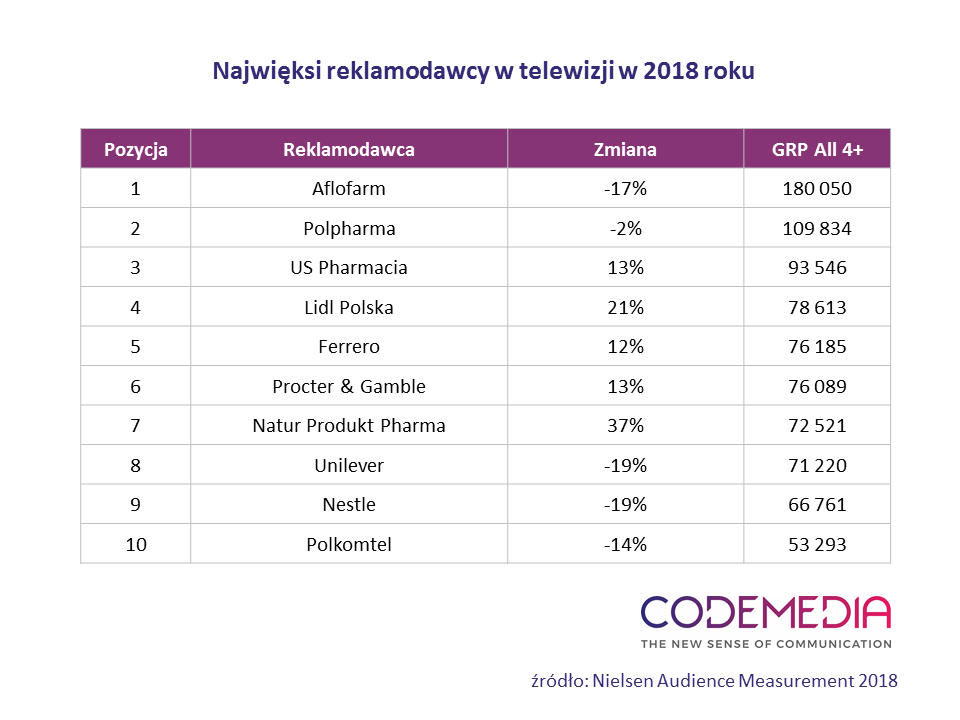 Największy wzrost procentowy w TOP10 względem poprzedniego roku (37%) również należy do przedstawiciela branży farmaceutycznej – firmy Natur Produkt Pharma. Co ciekawe, w 2017 roku producent ten nie znajdował się w zestawieniu, pomimo że zanotował największy, ponad 90%, wzrost. Z TOP10 zniknął z kolei GlaxoSmithKline, numer 10. w ubiegłorocznym rankingu. Producent zanotował 20% spadek i osiągnął 46 962 GRP – wynika z analizy Codemedia.