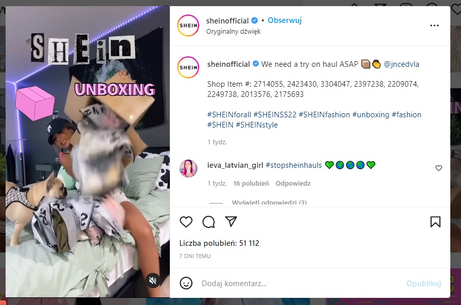 Viralowe treści na TikToku i Instagramie polegające na prezentowaniu nowych stylizacji przyciągają rzesze nowych klientów. Influencerki otwierają kartony przepełnione ubraniami Shein, tworząc z nich stylizacje, a tym samym nakręcają kolejne modowe trendy i szerzą hashtag #SheinHaul.