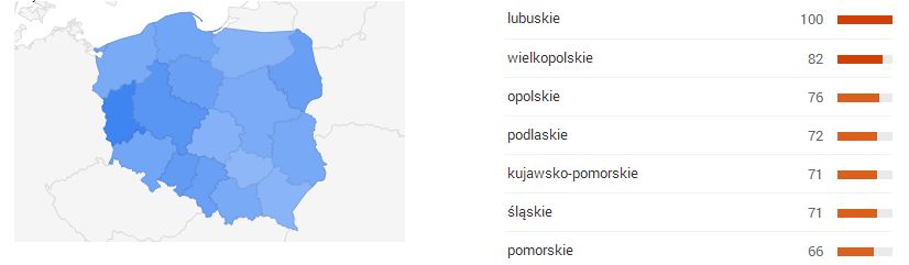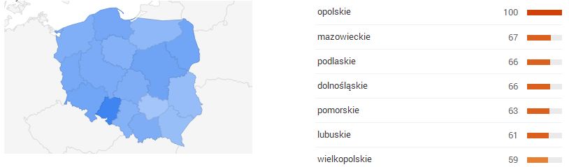 Także rosnąca popularność crossfitu znalazła swoje odzwierciedlenie w trendach wyszukiwania. Ośrodkiem największego zainteresowania tą dyscypliną okazała się być Opolszczyzna, zdecydowanie deklasująca inne województwa, jeśli chodzi o częstotliwość zapytań wpisywanych w wyszukiwarkę.