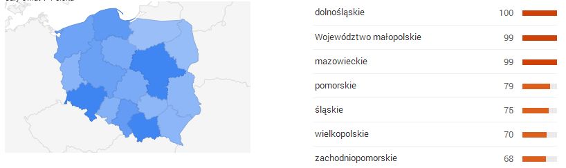 Jak widać, przy skutecznej promocji klubu fitness pod uwagę należy wziąć trendy sezonowe pozwalające tworzyć przekazy w czasie, w którym informacje te są właśnie wyszukiwane. Drugim ważnym czynnikiem determinującym powodzenie kampanii jest dopasowanie reklamy do położenia geograficznego klubu. Blink.pl sprawdził, jak przedstawiają się koszty reklamy wynikające ze zróżnicowania regionalnego na przykładzie promocji wg fraz „zumba” oraz „siłownia”.