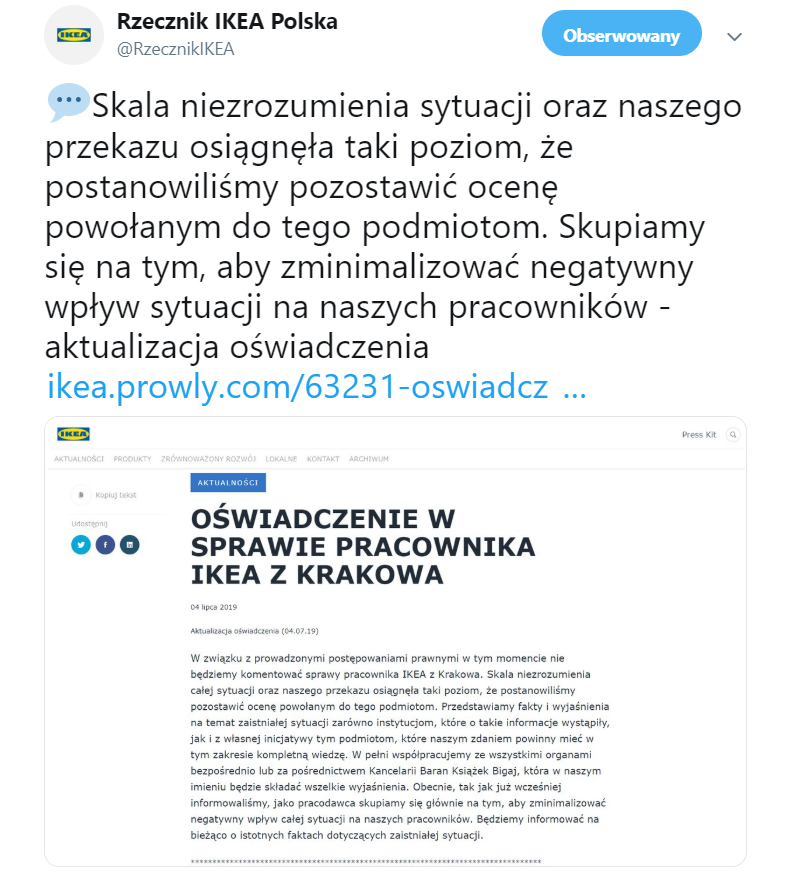 IKEA w odpowiedzi na burzę, jaka rozgorzała w mediach, opublikowała krótkie oświadczenie w związku z całą sytuacją – „(…) IKEA to firma otwarta światopoglądowo. Wśród nas są osoby różnych wierzeń, w tym wielu katolików. Szanujemy siebie wzajemnie, swoje poglądy i religie. Każdy ma prawo być sobą, czuć się bezpiecznie i być traktowany na równych prawach, z szacunkiem, jak każdy inny pracownik. W naszym miejscu pracy nie ma jednak miejsca na naruszanie godności innych pracowników, krzywdzenia osób ze względu na ich cechy osobiste, poglądy czy religie” – czytamy w oświadczeniu.