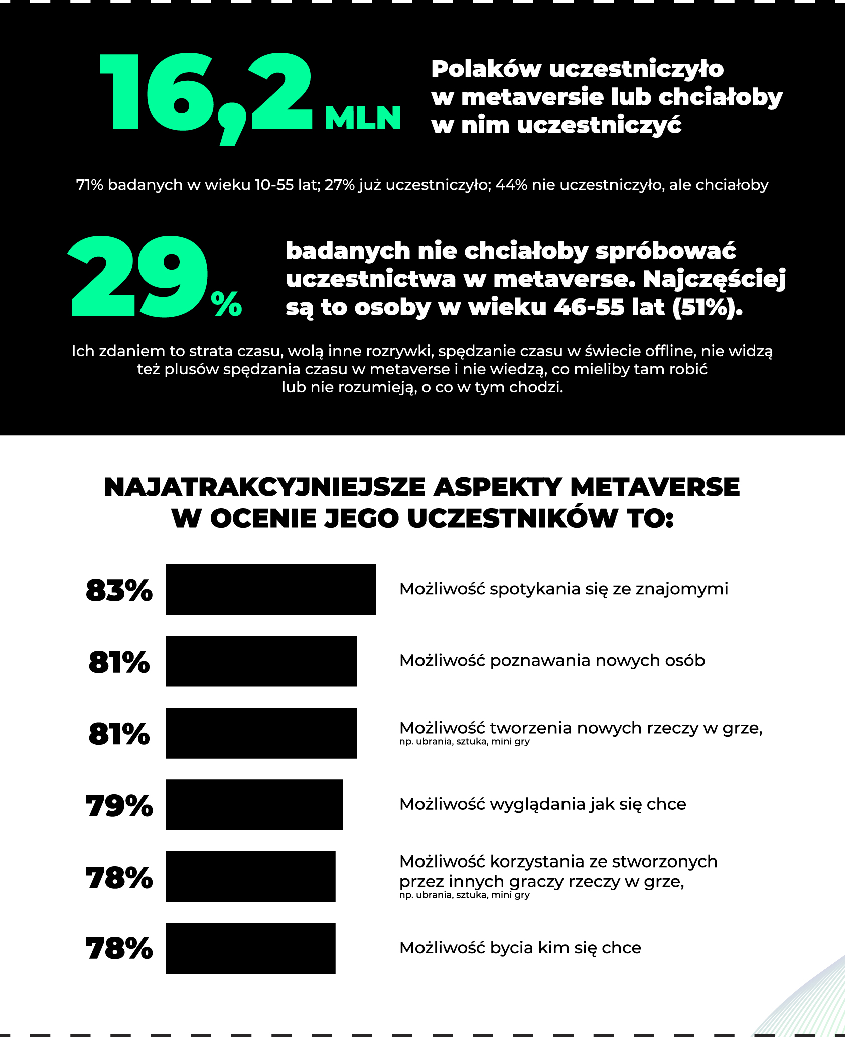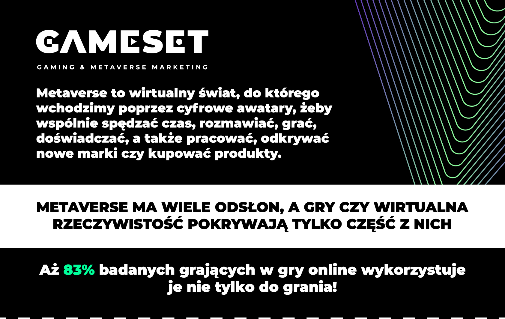 Wyniki pierwszego w Polsce badania potencjału wirtualnych światów wskazują na to, że ponad 16 milionów Polaków w wieku 10-55 lat uczestniczyło lub chciałoby uczestniczyć w metaverse. Badanie zostało zrealizowane przez IQS we współpracy z agencją Gameset, która tym samym ogłosiła strategiczne wejście w obszar metaverse marketingu. Agencja, która specjalizuje się m.in. w gaming marketingu, zdobyła niedawno pierwszą nagrodę (złoto) w prestiżowym konkursie MIXX Awards Europe 2022 za pierwszą w Europie kampanię employer brandingową opartą o zjawisko metaverse. Projekt zrealizowany dla Grupy Erbud nie był jednak pierwszą kampanią wirtualnym świecie w wykonaniu Gamesetu.