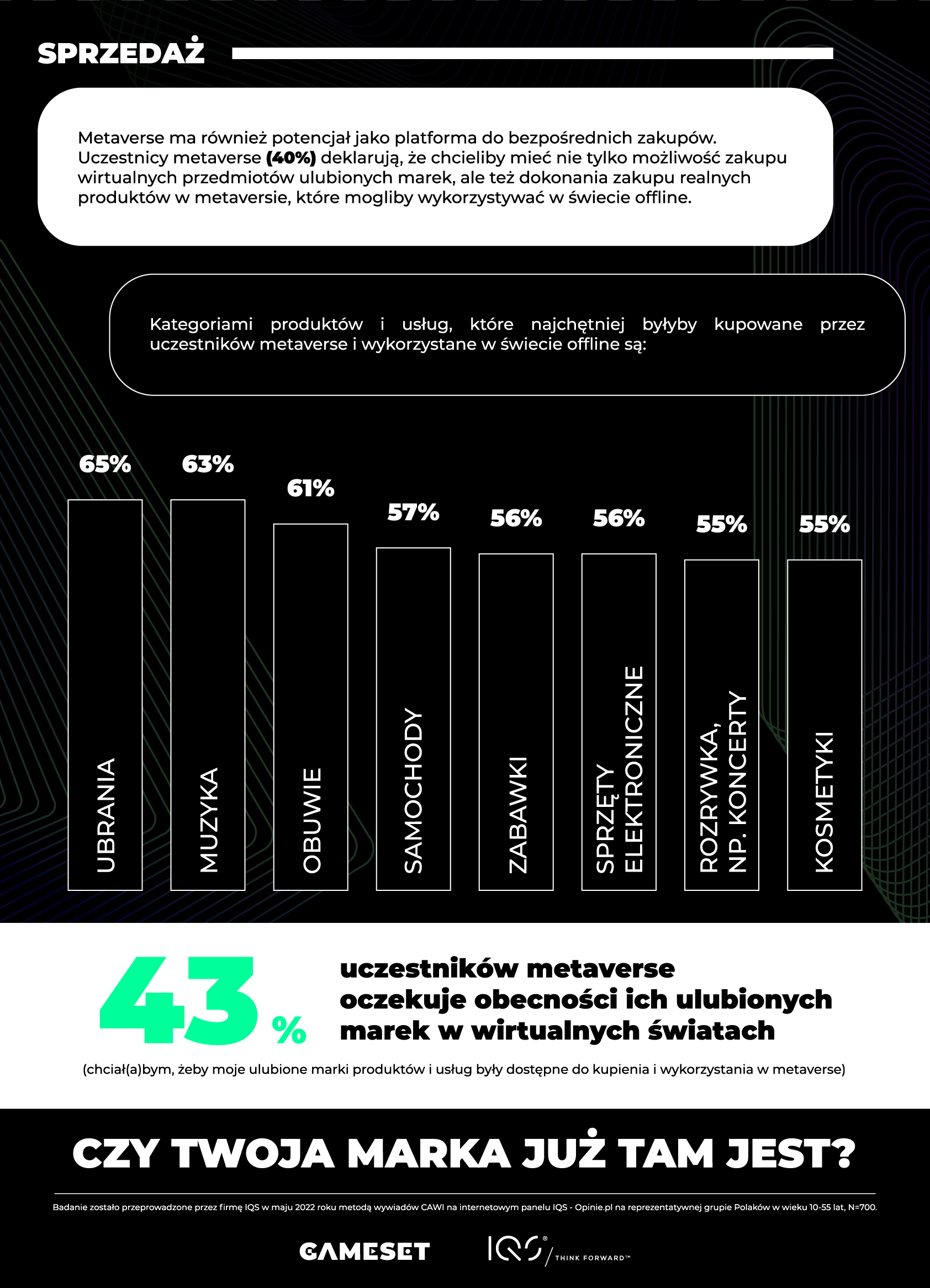 Rezultaty badań świadczą też o tym, że metaverse ma potencjał jako platforma do bezpośrednich zakupów. 4/10 uczestników metaverse deklaruje, że chciałoby mieć możliwość nie tylko zakupu wirtualnych przedmiotów ulubionych marek do wykorzystania w metaversie, ale również dokonania zakupu realnych produktów w wirtualnym świecie, które mogliby wykorzystywać offline.