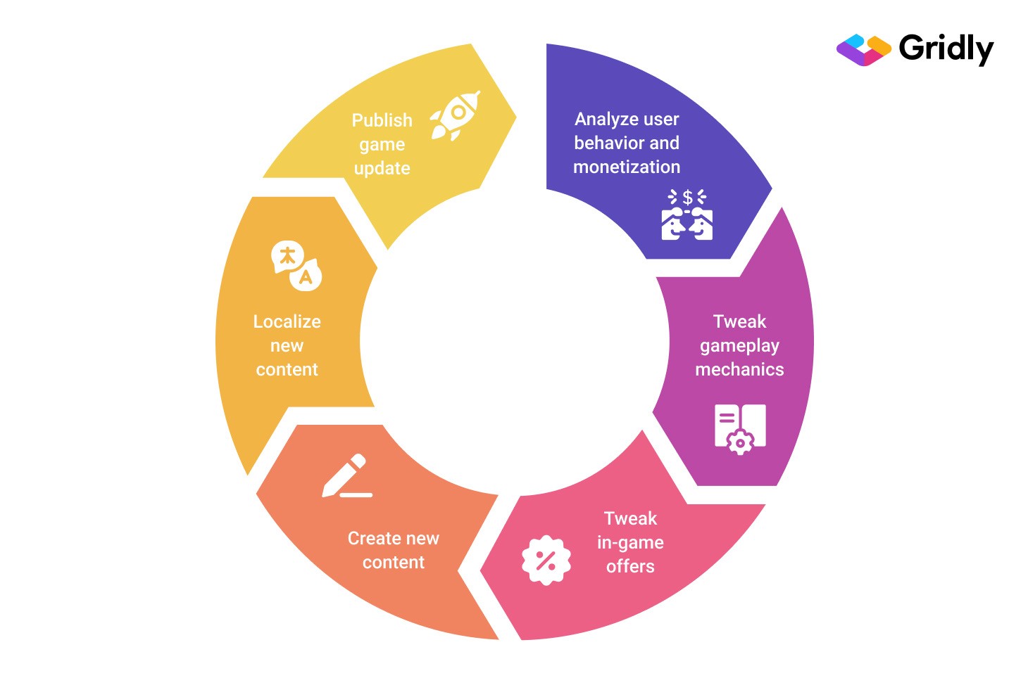 Lifetime value gry zostaje automatycznie wydłużone poprzez kolejne iteracje dodawane do tytułu. Na ulepszenia w rozgrywce czy dodanie nowych przedmiotów nie trzeba już czekać wyłącznie do premiery nowej części lub kolejnego pakietu DLC – te dodawane mogą być nawet codziennie. Jak wygląda proces tworzenia takich aktualizacji możemy zobaczyć na poniższej ilustracji.