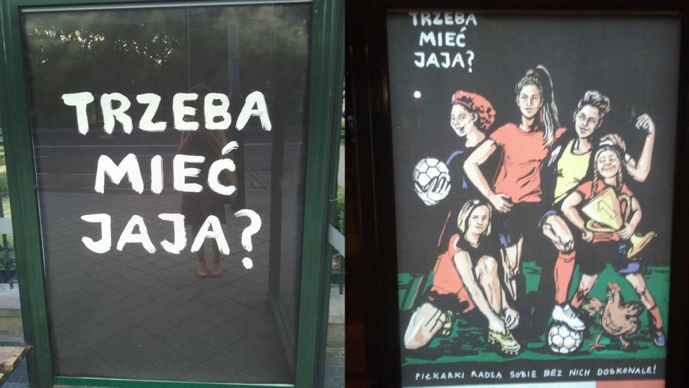 Na początku lipca na wiatach przystankowych w Poznaniu pojawiły się plakaty z pytaniem „Trzeba Mieć Jaja?”. Pierwszy komunikat miał na celu wzbudzenie zainteresowania wśród odbiorców. 16 lipca pojawił się drugi plakat odsłaniający szczegóły akcji: sylwetki piłkarek, hasło przewodnie oraz hasztag #NoBezJaj.
