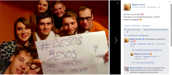 Jeżeli chodzi o budowanie relacji w social mediach – prym wiodą przede wszystkim Magda Gessler oraz Piotr Ogiński z Kocham gotować. Restauratorka znana jest Internautom przede wszystkim jako szczera i niezwykle emocjonalna osoba – na swoim fanpage’u zabiera głos w sprawie bieżących wydarzeń, uchyla rąbka tajemnicy ukazując życie prywatne. Gessler jest popularna do tego stopnia, że poświęca się jej internetowej twórczości osobne fanpage, a czynność taką jak czytanie jej wpisów, określa się mianem hobby 😉 Na Facebooku może się pochwalić ogromną rzeszą fanów – lubi ją blisko 1 000 000 użytkowników!