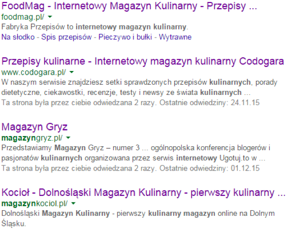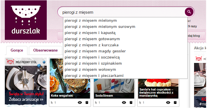 Czym są? Agregatory kulinarne są serwisami gromadzącymi w jednym miejscu przepisy z kilku stron. Działają na zasadzie wyszukiwarki – jeżeli mamy ochotę na pierogi z mięsem, wpisujemy taką frazę i po chwili dostajemy kilkadziesiąt propozycji. Obecność w tego rodzaju serwisach powinna być jednym z priorytetów zarówno początkującego blogera kulinarnego, jak i starego wyjadacza. Dzięki nim zyska większy ruch na stronie, ponieważ są one wysoko pozycjonowane w Google, oraz społeczność – zadowolony użytkownik z pewnością zapamięta adres bloga i na niego wróci. Może nawet podzieli się przepisem udostępniając go na swojej facebookowej tablicy?