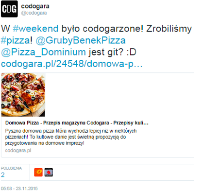Wszystkie ikony social media są aktywne, a publikacje postów cykliczne. Główną osią komunikacji SM jest fanpage, na którym 2 razy dziennie ukazuje się wpis z przepisem w porze obiadowej oraz artykułem ok. godziny 20:00. Swoją komunikację wspierają również Twitterem – za pomocą tego kanału są w stanie dotrzeć do mobilnego użytkownika i zaproponować mu szybki przepis na obiad.