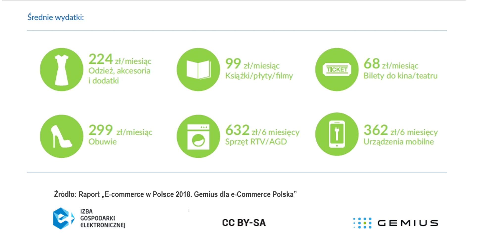 Z raportu wynika, że wydatki na większość popularnych wśród internautów produktów wzrosły w porównaniu z poprzednim rokiem. E-konsumenci średnio miesięcznie przeznaczyli na odzież, buty, książki oraz bilety do kina i teatru odpowiednio 224 zł, 299 zł, 99 zł i 68 zł. We wszystkich przypadkach było to więcej niż w zeszłym roku. Ankietowani wskazali również wyższe kwoty, jeśli chodzi o wydatki na sprzęt RTV i AGD (632 zł) oraz urządzenia mobilne (362 zł).