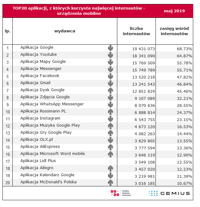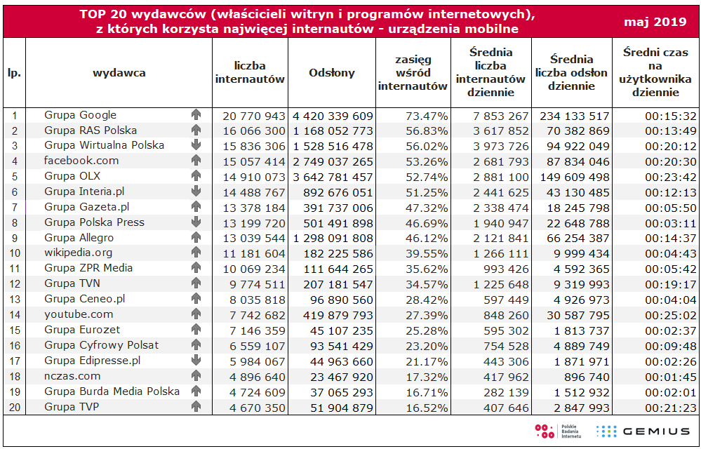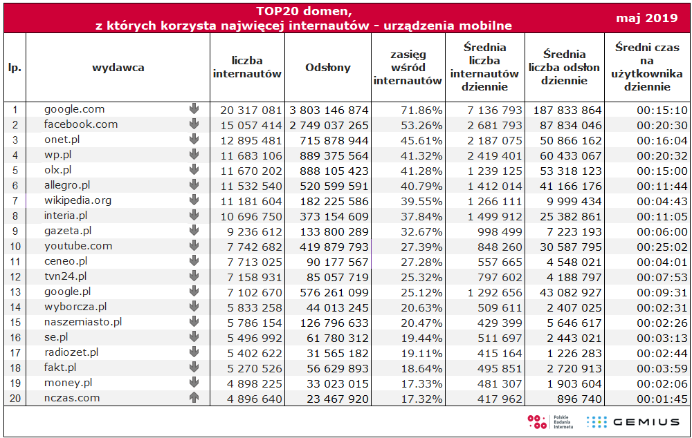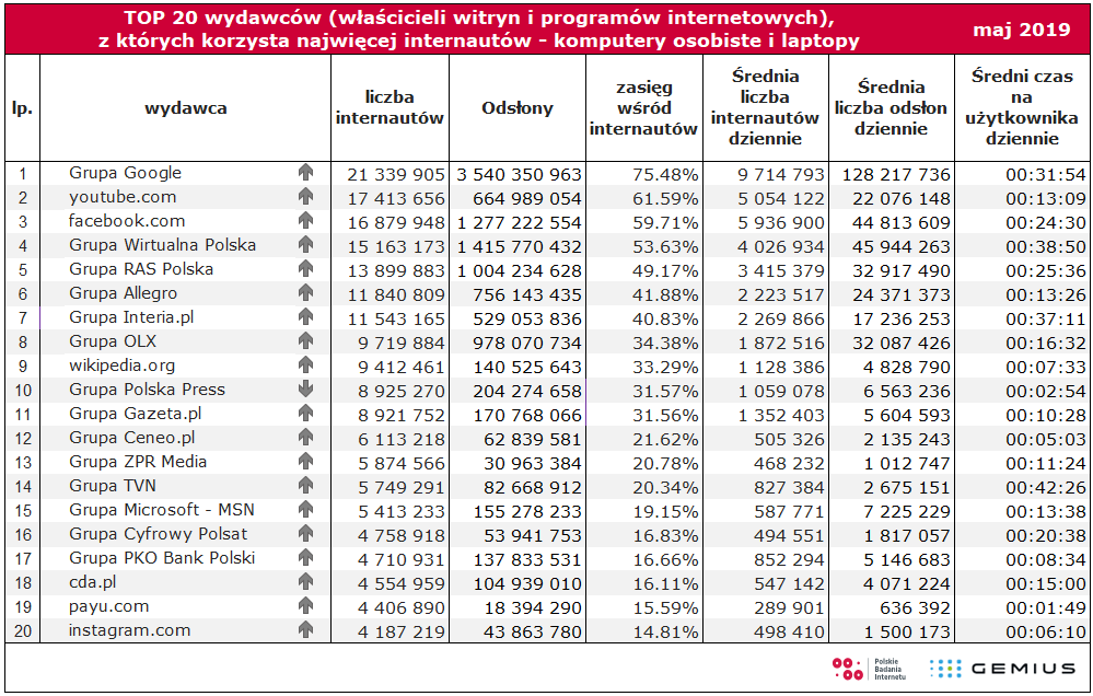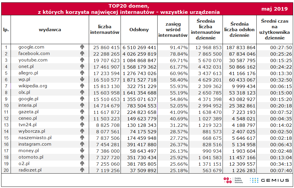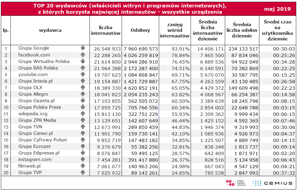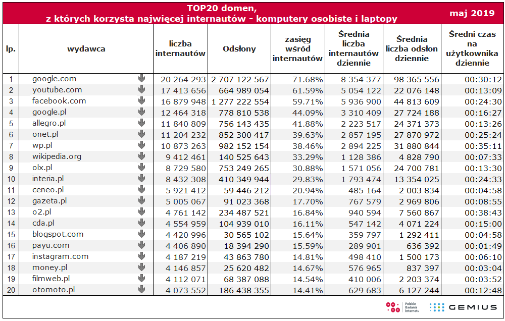 Liczba internautów w Polsce we wrześniu 2018 roku wyniosła ogółem 28,3 mln, z czego na komputerach osobistych i laptopach (komputery osobiste używane w domu oraz w pracy) – 22,8 mln, a na urządzeniach mobilnych (smartfony i tablety) 24,3 mln.