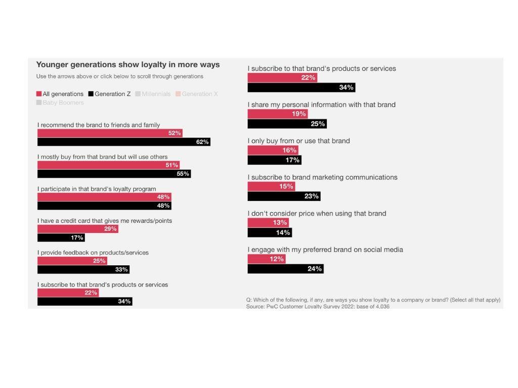 Z kolei marki powinny pamiętać, że „Zetki” bardziej niż inne pokolenia cenią sobie nagrody w stylu „nie da się kupić za pieniądze” i korzyści wynikające z partnerstwa z marką. Według badania klientów For Love or Money™ 2022 przeprowadzonego przez The Point of Loyalty, członkowie pokolenia Z (49%) są znacznie mniej skoncentrowani na nagrodach finansowych, wolą natomiast doświadczenie, nagrody w postaci darowizny na cele charytatywne.