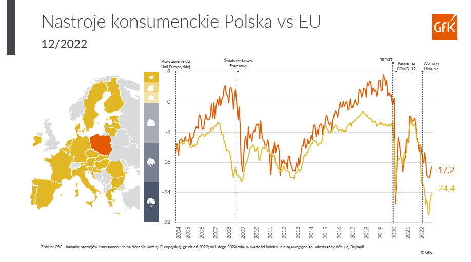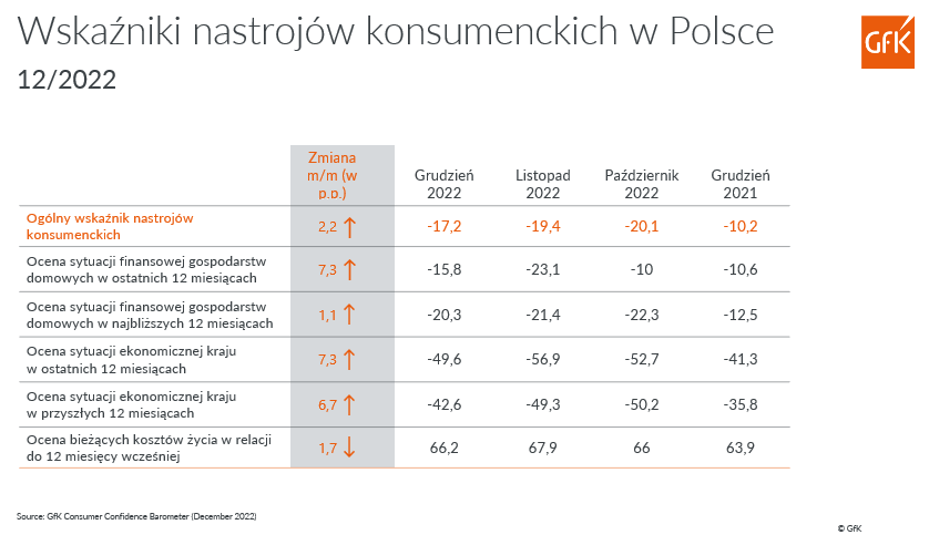 Barometr Nastrojów Konsumenckich GfK, czyli syntetyczny wskaźnik ilustrujący aktualne nastroje Polaków w zakresie postaw konsumenckich, wyniósł w grudniu 2022 r. -17,2 i wzrósł o 2,2 p.p. w stosunku do poprzedniego miesiąca. Tym samym średni, roczny wskaźnik barometru wyniósł -16 punktów, co oznacza drugi najniższy wynik w historii badań. Przeciętne gorsze nastroje w Polsce firma GfK odnotowała wyłącznie w 2012 roku – wówczas wskaźnik osiągnął poziom -16,3.