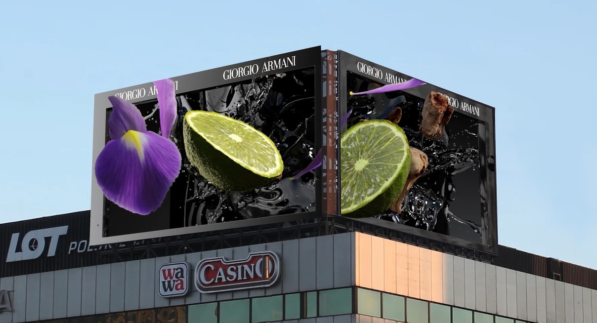 Najnowsza odsłona kampanii w formacie 3D Digital Out of Home została przygotowana dla marki Giorgio Armani na zlecenie L’Oréal Polska Sp. z o.o. Tego typu reklamy coraz częściej są wyświetlane na billboardach w największych światowych metropoliach, przyciągając uwagę widzów. Zastosowanie najnowszych technologicznie rozwiązań sprawia, że stają się też często elementem viralowych kampanii marketingowych.