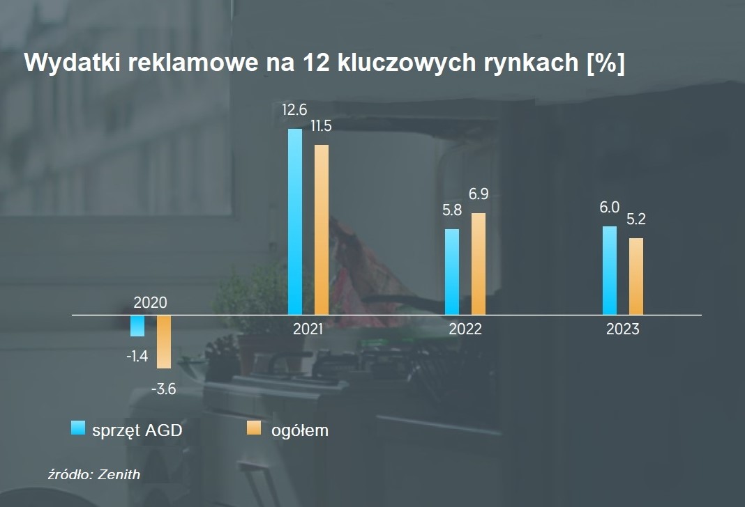Agencja mediowa Zenith przewiduje, że globalne wydatki na reklamę marek AGD wzrosną z 4,4 mld USD w 2020 do 5,0 mld USD w 2021 roku, znacznie przekraczając poziom 4,5 mld USD wydanych w 2019 roku jeszcze przed pandemią. Do 2023 roku wydatki reklamowe osiągną 5,6 mld USD.