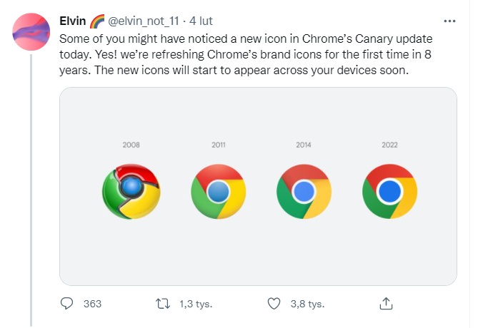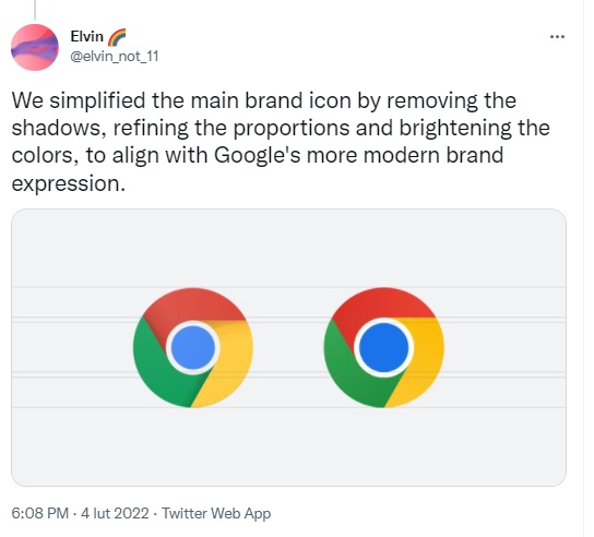 Obecne logo to już czwarty projekt w historii 14-letniej przeglądarki. Ewolucje kolorowego kółeczka Google Chrome podsumował w swoich mediach społecznościowych Elvin Hu. Projektant poświęcił nowemu logo kilkanaście postów na swoim Twitterze.