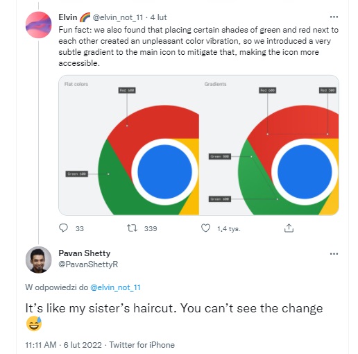 Stwierdziliśmy, że umieszczenie pewnych odcieni zieleni i czerwieni obok siebie powoduje nieprzyjemne wibracje kolorów, więc wprowadziliśmy bardzo subtelny gradient do głównej ikony, aby złagodzić ten efekt i uczynić ikonę bardziej dostępną – poinformował Elvin Hu, projektant Chrome.