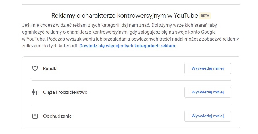 Teraz w panelu „Ustawienia reklam” w przeglądarce Google lista „Reklamy o charakterze kontrowersyjnym w YouTube” powiększyła się o kilka nowych kategorii. Użytkownicy nie będą musieli oglądać treści promocyjnych dotyczących randek, rodzicielstwa i ciąży oraz utraty wagi.