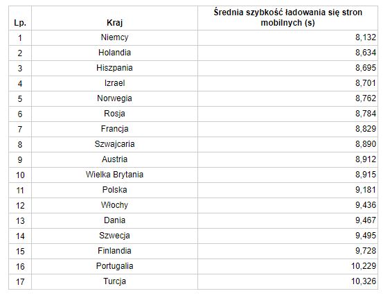 Wiedząc już jak ważna jest prędkość, warto przyjrzeć się funkcjonowaniu europejskich stron. Google przetestował szybkość stron, na które użytkownik jest przekierowywany po kliknięciu w reklamę mobilną (landing pages). Badaniu zostały poddane strony z 17 europejskich krajów z 11 branż. Okazało się, że średni czas ładowania wynosi obecnie 9,124 sekundy, czyli o 6 sekund więcej niż wskazana granica 3 sekund. Najszybsze okazały się strony z ogłoszeniami i informacjami lokalnymi ze średnią prędkością ładowania 8,148 sekundy, a kolejno branży finansowej z 8,227 sekundy oraz edukacji i administracji publicznej z 8,6 sekundy. Co ciekawe w związku z często impulsywną naturą zakupów mobilnych, strony z obszaru sprzedaży detalicznej ładowały się najwolniej, bo około 10,29 sekundy. Zostały jednak nieznacznie wyprzedzone przez branżę motoryzacyjną z wynikiem 10,259 sekundy.