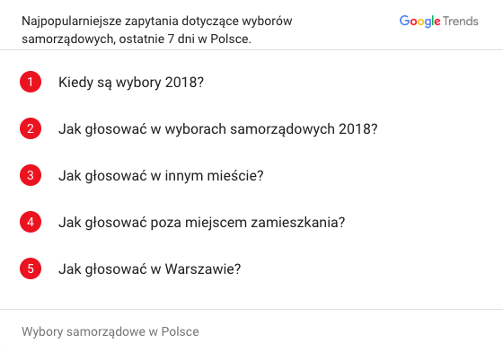 Z okazji zbliżających się wyborów samorządowych Google uruchomiło specjalny serwis, na którym można śledzić najpopularniejsze zapytania dotyczące samych wyborów oraz hasła z nimi powiązane. A zatem możemy dowiedzieć się jakie tematy okołowyborcze zajmują internautów oraz jakich partii i komitetów szukają. Prezentujemy również informacje o tym jak często internauci wyszukują poszczególnych kandydatów na prezydentów stolic wszystkich 16 województw. Zainteresowanie wyszukiwanymi informacjami można zobrazować również na wykresie i sprawdzić jak zmieniało się na przestrzeni czasu.