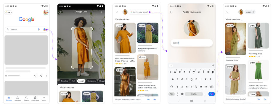 Przykładowo, dodając zdjęcie pomarańczowej sukienki, wystarczy dopisać „zielony”, aby Google wyszukało konkretny produkt w innej wersji kolorystycznej.