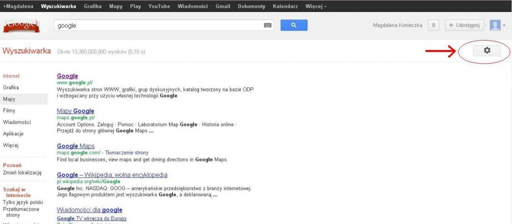 Wyszukiwać można na dwa sposoby. Pierwszy to wpisanie krótkiej kwerendy w okno wyszukiwarki. Zapytanie musi być precyzyjnie podane, najlepiej przy użyciu niewielkiej liczby słów kluczowych (pamiętajmy przy tym, że ważna jest również kolejność wpisania tych słów – zawsze zaczynamy od najważniejszego). Drugi, efektywniejszy, to skorzystanie z tzw. wyszukiwania zaawansowanego – dostęp za pomocą ikonki koła zębatego, znajdującego się w prawym górnym rogu wyników w wyszukiwaniu prostym: