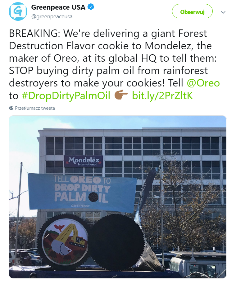 W związku z tym Greenpeace stworzyło akcję „Tell Oreo to #DropDirtyPalmOil”, której celem jest wywarcie wpływu na firmie Mondelez International, by zaprzestała używania oleju palmowego z niesprawdzonych źródeł.