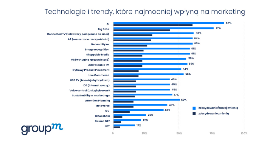 AI (sztuczna inteligencja) plasuje się na szczycie rankingu technologii, które zmienią branżową rzeczywistość, pokazuje badanie GroupM zrealizowane wśród przedstawicieli rynku reklamowego, tj. pracowników agencji, biur reklamy oraz marketerów. AI będzie miała większy wpływ na rynek niż Big Data, Connected TV czy wskazywane dalej AR (rozszerzona rzeczywistość), geonalityka lub image recognition (rozpoznawanie obrazu) – plasujące się również w czołówce listy. Znacznie mniejszą wiarę w ich przełożenie na marketingową rzeczywistość branża pokłada zaś w takich technologiach i zjawiskach jak NFT, blockchain, zielone GRP oraz metaverse czy 5G.