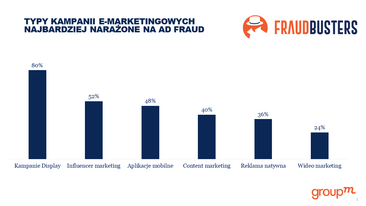 Wśród poszczególnych modeli zakupów kampanii online najbardziej narażony na Ad Fraud wydaje się polskim marketerom performance marketing (kampanie rozliczane za efekt), choć większość badanych powiedziała w badaniu GroupM, że model zakupu nie ma większego znaczenia. Wśród typów kampanii niosących najwyższe ryzyko fraudu, reklamodawcy najczęściej wskazywali tradycyjny display lub działania z udziałem influencerów.
