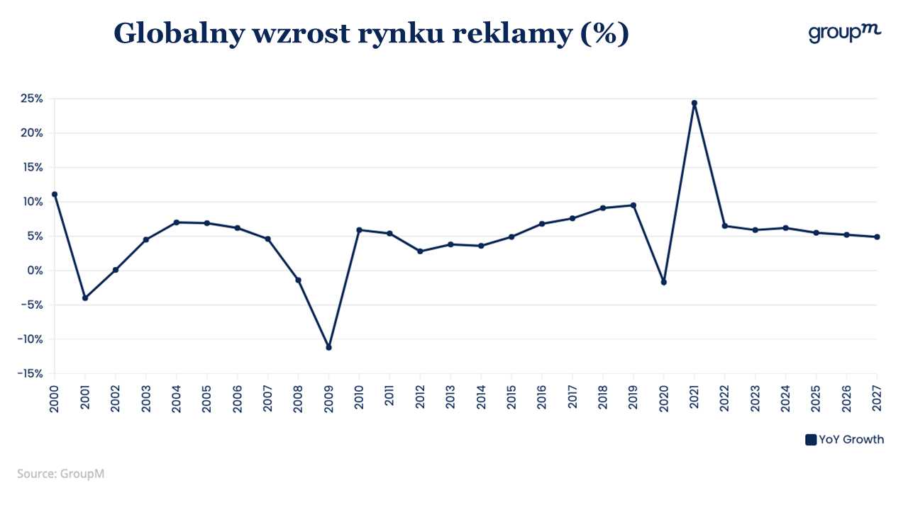 Na dynamikę globalnego rynku reklamy w 2022 r. w największej mierze zapracował internet, z 9,3 proc. wzrostem. GroupM oczekuje, że reklama digital osiągnie na koniec roku aż 67 proc. udziału w całości globalnego reklamowego tortu, zaś w 2027 roku będzie to już 73 proc. Udział ten nie uwzględnia tzw. digital extensions, czyli cyfrowych kanałów należących do mediów tradycyjnych (jak serwisy VOD nadawców, czy digital OOH).