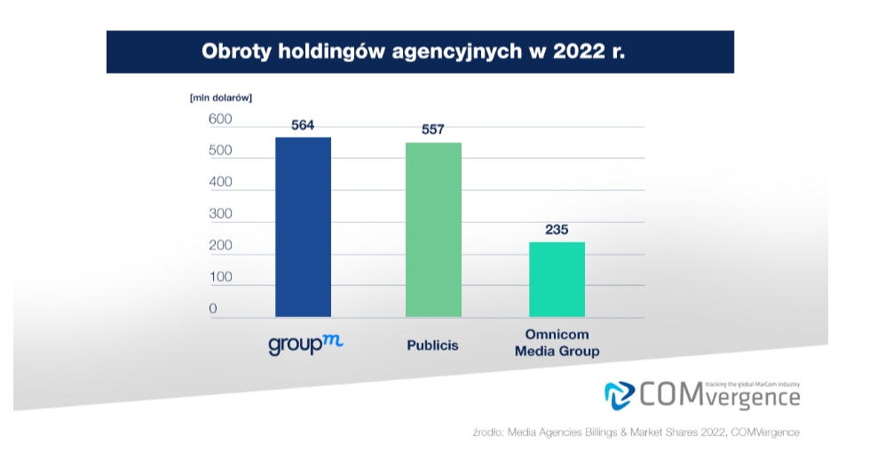 GroupM, inwestycyjno-technologiczna platforma agencji Wavemaker, EssenceMediacom i Mindshare, uplasowała się na szczycie zestawienia największych – pod względem obrotów – grup mediowych w Polsce za 2022 rok. COMvergence oszacował udział GroupM w rynku agencyjnym (zsumowane obroty agencji) na 30 proc., a udział w całym rynku reklamowym (obroty agencji oraz wydatki klientów bezpośrednich) – na 22,5 proc. GroupM nieznacznie wyprzedza w rankingu największych holdingów w Polsce Publicis Media, a ci dwaj gracze utrzymują wyraźną przewagę nad kolejnymi w zestawieniu Omnicom Media, Dentsu czy Mediabrands.