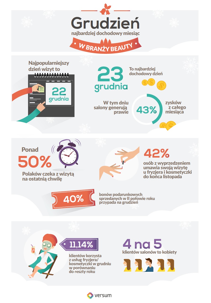 Na podstawie raportu „Grudzień najbardziej dochodowy miesiąc w branży beauty” przygotowane w oparciu o dane uzyskane od klientów Versum w okresie 2016 – 2017.