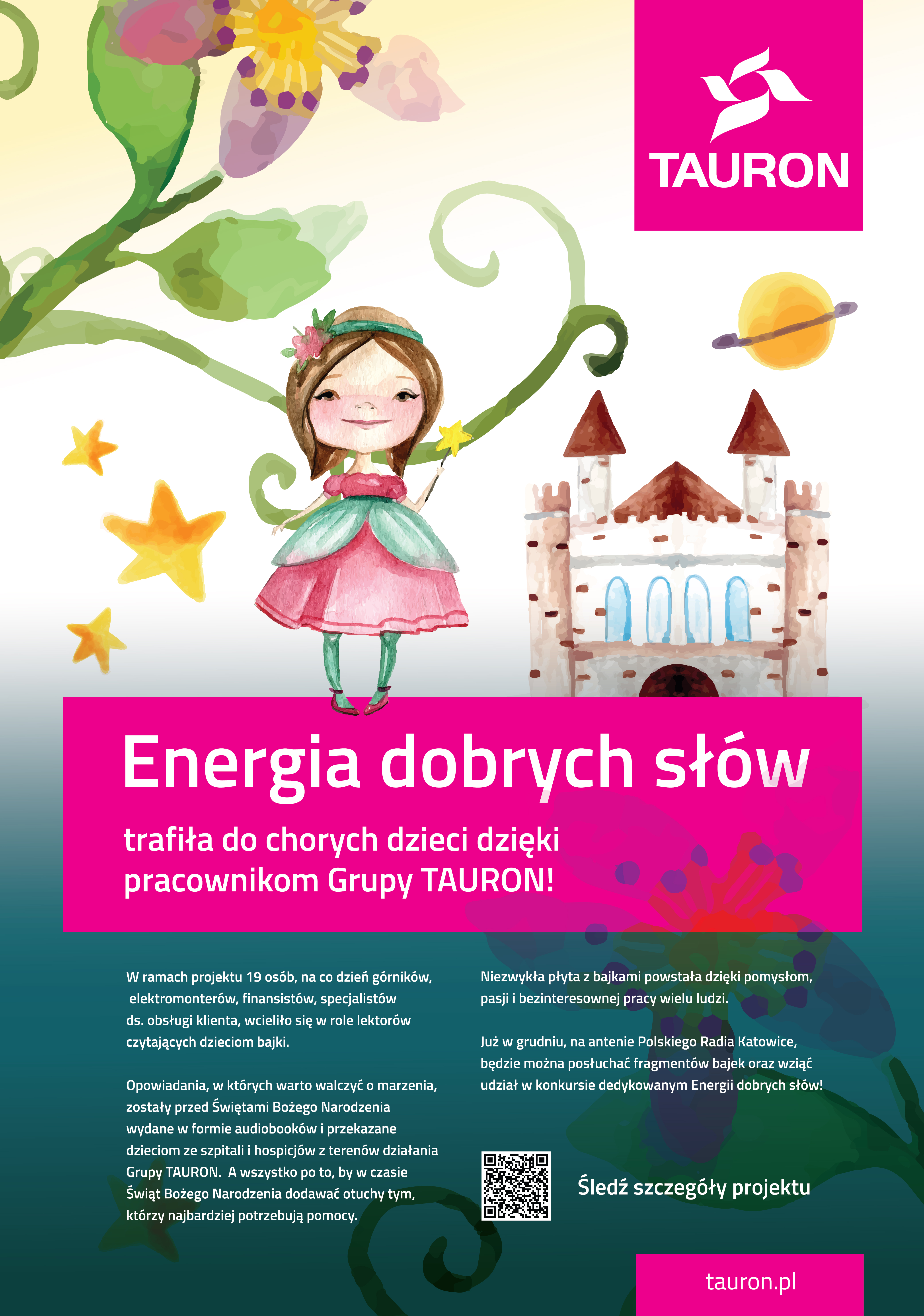 Energia dobrych słów jest kolejnym adresowanym do dzieci projektem z zakresu społecznej odpowiedzialności TAURONA, którego niezwykłość polega w znacznej mierze na tym, że został zrealizowany w znacznej mierze przez samych pracowników Grupy. – Bajki czytali: Joanna Kwiatkowska, Marta Wachowska, Barbara Kuzoń, Ewelina Boguszewska, Adam Bugiel, Małgorzata Rzepa, Sebastian Pandzich, Katarzyna Nowak, Ewa Gawlik, Marta Gurska, Wioleta Łabędź, Anna Suchy, Agnieszka Indyka, Jarosław Kocot, Sabina Pająk, Mateusz Orłowski, Katarzyna Tajchman, Jan Świdroń, Grzegorz Konopka.