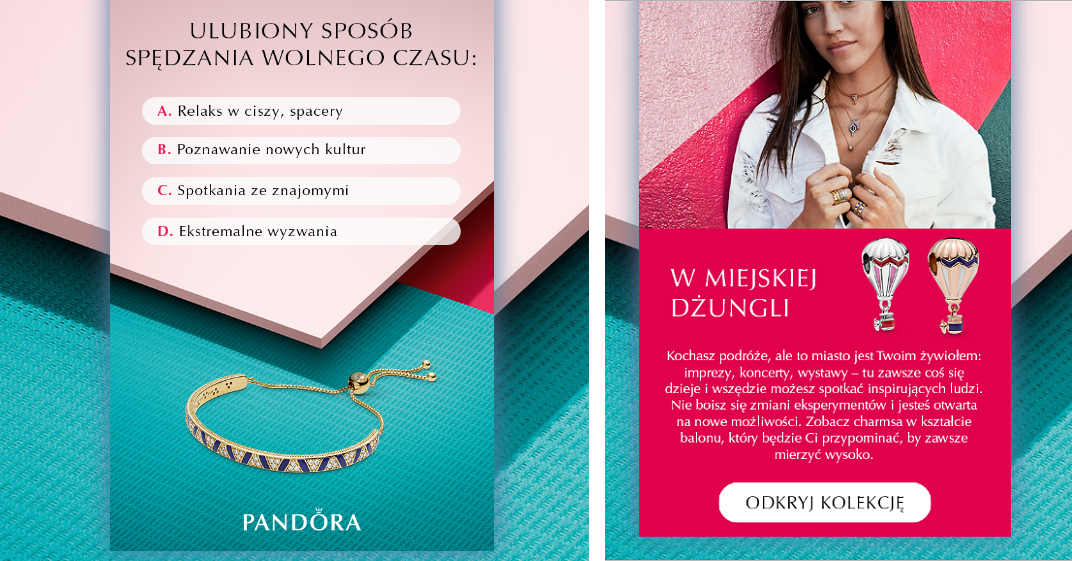 Do zabawy zaprasza też Pandora, marka biżuterii z salonami stacjonarnymi i sprzedażą online. Organizuje ona różnego rodzaju quizy i zabawy, angażując swoich klientów w większą interakcję z marką.