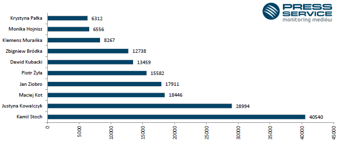 Rekordową liczbę publikacji uzyskał Kamil Stoch, o którym pojawiło się prawie 41 tys. materiałów – najwięcej w lutym – których ekwiwalent reklamowy opiewał na… 233 mln zł. Drugie miejsce przypadło Justynie Kowalczyk (29 tys. publikacji i 181 mln zł ekwiwalentu reklamowego). Za plecami dwojga liderów znalazł się Maciej Kot (odpowiednio 18 tys. i 78 mln zł).