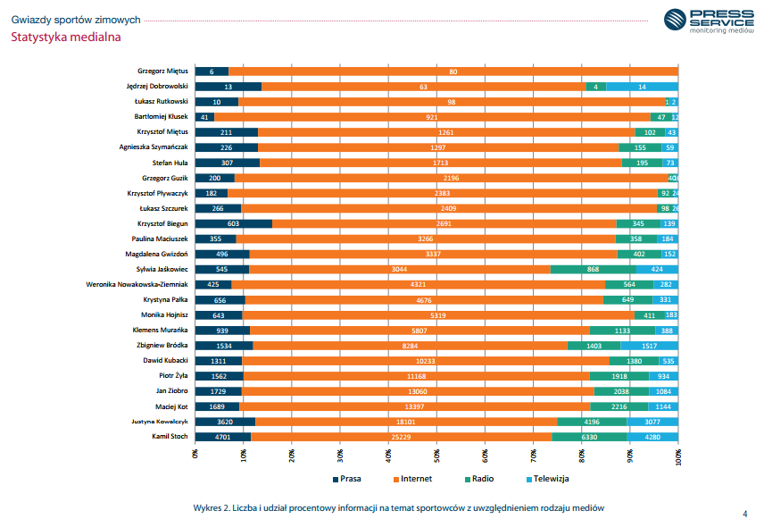 64 proc. przebadanych publikacji pochodziło z internetu. 15 proc. stanowiły materiały radiowe, 11 proc. prasowe, a 10 proc. telewizyjne. Zarówno o Kamilu Stochu, jak i Justynie Kowalczyk najwięcej materiałów wyemitowała TVP Info. Z kolei o Zbigniewie Bródce najczęściej mówiło się w stacji Polsat News.