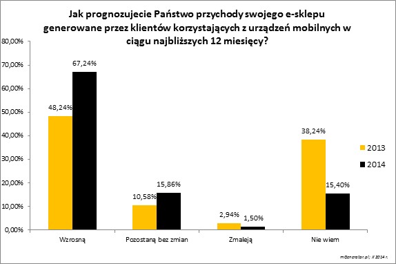 Ostatnie 12 miesięcy to nie tylko systematyczny wzrost liczby sklepów posiadających rozwiązania mobilne. To także większa aktywność konsumentów w obszarze zakupów mobilnych. – Już co piąty przedstawicieli e-sklepów deklaruje, że takie transakcje stanowią od 5 do 10 proc. wszystkich zamówień. W roku ubiegłym twierdziło tak zaledwie 12 proc. z nich. Większy jest też ich optymizm, co do wzrostu przychodów ze sprzedaży mobilnej. Prawie 70 proc. z nich prognozuje, że ulegną one zwiększeniu. Dla porównania, w ubiegłym roku twierdziło tak mniej niż 50 proc. badanych. – dodaje Piotr Krawiec z mGenerator.pl.
