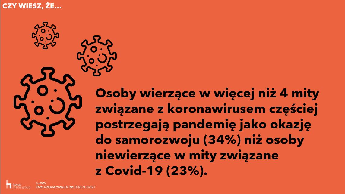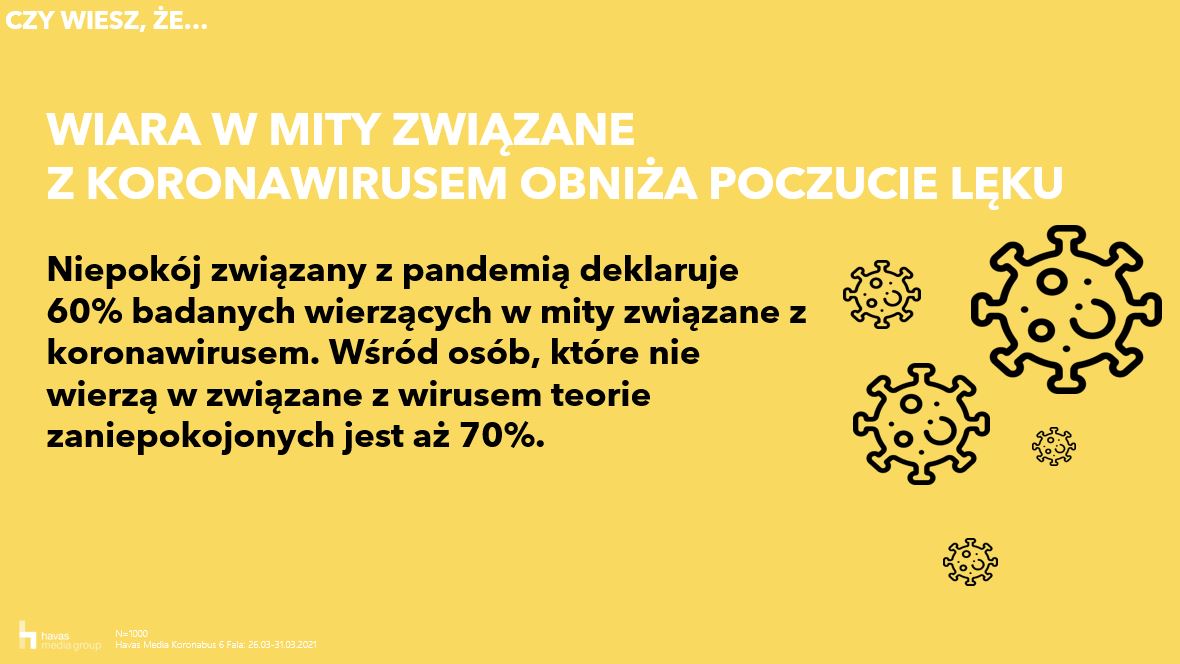 Mimo uznawania lekarzy za jedno z najbardziej wiarygodnych źródeł informacji o pandemii, Polacy chętnie wierzą w mity związane z koronawirusem. 57% badanych sądzi, że koronawirus jest jedynie okazją do zarobku dla firm farmaceutycznych, a połowa Polaków uważa, że został on stworzony przez człowieka w laboratorium. Mit ten jest bardziej popularny wśród starszych Polaków – wierzy w niego 56% badanych w wieku 44-54 lata i jedynie 41% z grupy wiekowej 18-24. Aż jedna trzecia Polaków ma sceptyczny stosunek do szczepionek – według nich nie tylko nie zapewniają ochrony przed wirusem, mogą być także szkodliwe dla naszego zdrowia. Najrzadziej wierzymy w rzekomy wpływ sieci 5G na rozprzestrzenianie się wirusa.