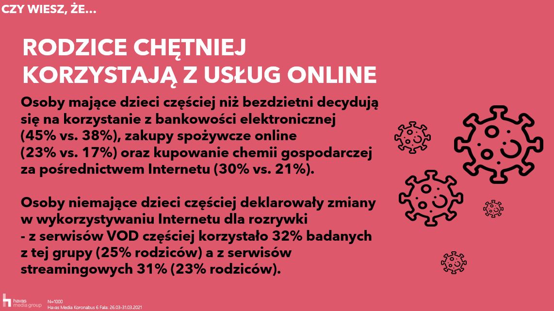 Zmiany, jakie pandemia spowodowała w nawykach Polaków zostały z nami na dłużej. Podobnie jak w maju ubiegłego roku niemal połowa Polaków (48%) nadal deklaruje, że częściej niż przed pandemią samodzielnie gotuje w domu, 42% częściej korzysta z bankowości internetowej. Jeszcze częściej niż w 2020 korzystamy z możliwości zamówienia jedzenia do domu (32% vs. 26% w maju 2020) oraz zakupu ubrań czy dodatków online (32% vs. 25% w 4 fali badania).