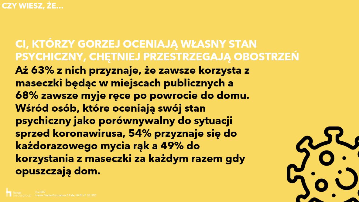 Po 12 miesiącach w pandemii, niemal 70% badanych nadal czuje się zaniepokojonych sytuacją związaną z koronawirusem. Podobnie jak w marcu ubiegłego roku, ponad połowa Polaków deklaruje, że zarówno ich jakość życia jak i stan psychiczny pogorszyły się w porównaniu do czasu przed pandemią. Badani częściej niż przed pandemią odczuwają takie emocje jak irytacja, zmęczenie i złość a podobnie często jak w marcu i kwietniu ubiegłego roku czują lęk i strach. Polacy obawiają się przede wszystkim o wydolność służby zdrowia (87%) oraz zdrowie swoje i bliskich (82%). Od poprzedniego roku wzrosło zaniepokojenie badanych nauką zdalną w szkołach i na uczelniach (71%) oraz sytuacją polityczną (72%).