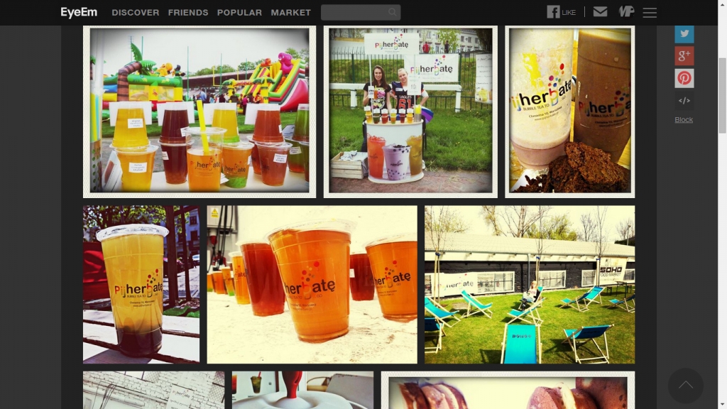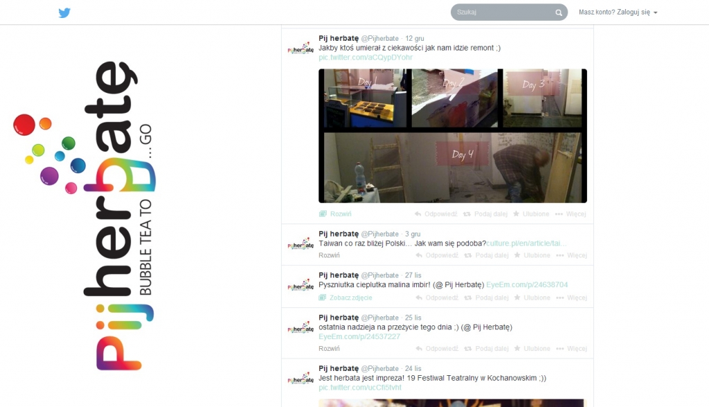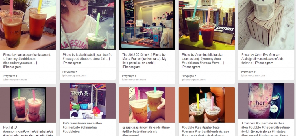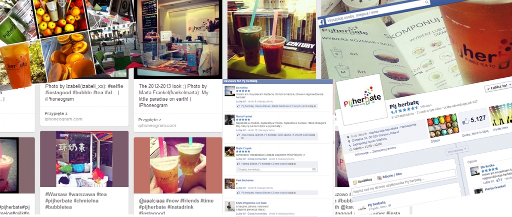 Szybko uznałyśmy, że nie będziemy ograniczały się do obecności tylko na jednym portalu. Wpisy związane z „Pij herbatę” można znaleźć m.in. w serwisach Twitter, Pinterest czy Foursquare. Korzystamy także z portali ściśle związanych z gastronomią (np. PobiteGary) oraz z mało znanej w Polsce aplikacji społecznościowej EyeEm, działający w sposób podobny do Instagramu, w oparciu o publikowane zdjęcia ze wskazaną lokalizacją.