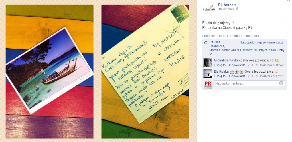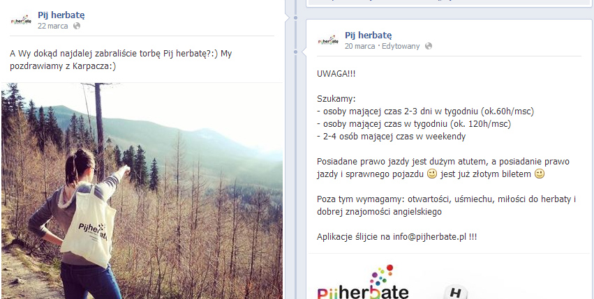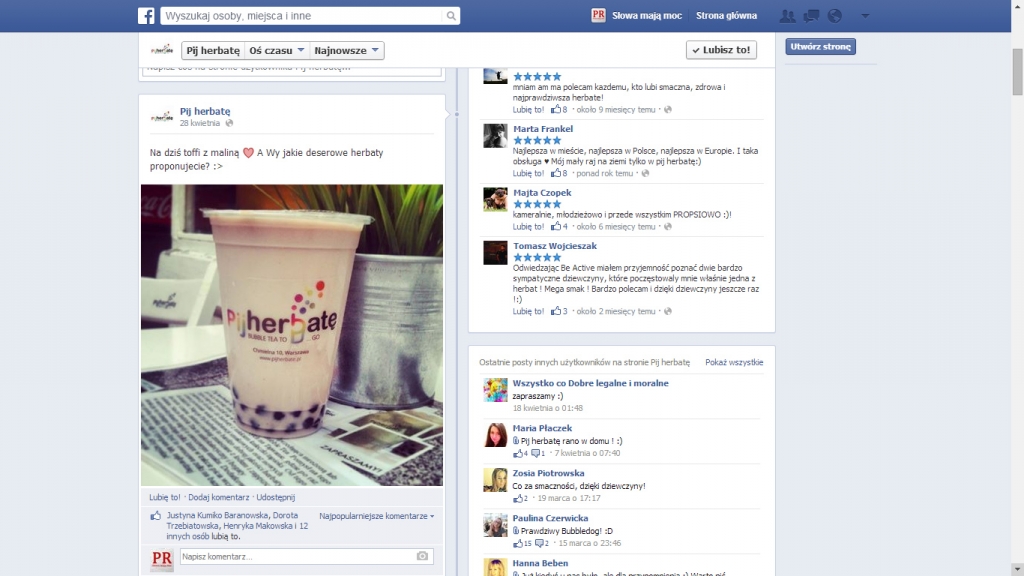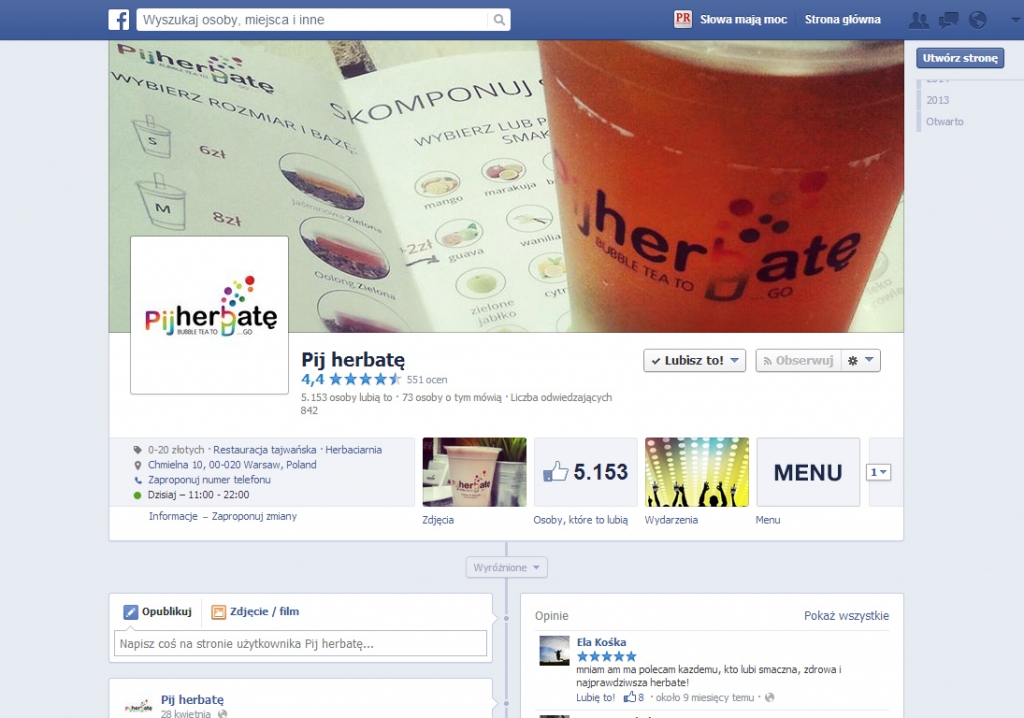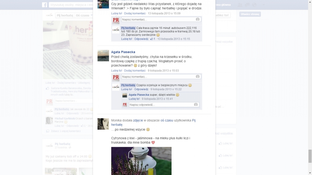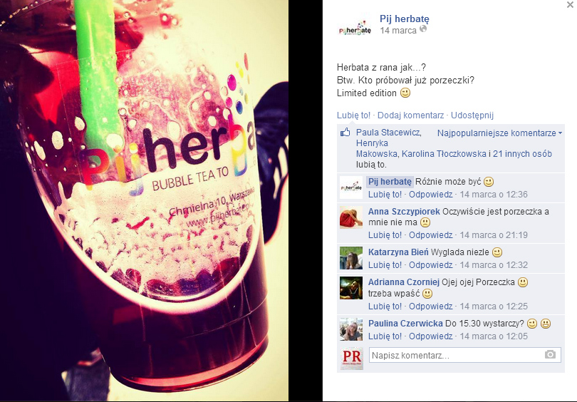 Prowadząc profil firmy pamiętaj, że robisz to przede wszystkim dla klientów. Dlatego dostosuj wpisy, ich formę i charakter do oczekiwań Twojej grupy docelowej. Praktyka pokazała, że w przypadku „Pij herbatę” wpisy o charakterze informacyjnym lepiej jest publikować rano lub późnym wieczorem, natomiast popołudniu można już skoncentrować się na apetycznych zdjęciach, które skuszą internautów do odwiedzenia lokalu po szkole lub pracy.